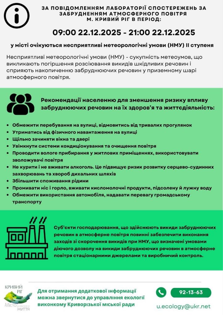 22 грудня з 9:00 до 21:00 у Кривому Розі буде спостерігатися погіршення погодних умов. Через це у нижніх шарах атмосфери накопичуються шкідливі речовини. Містянам радять скоротити своє перебування на вулиці.