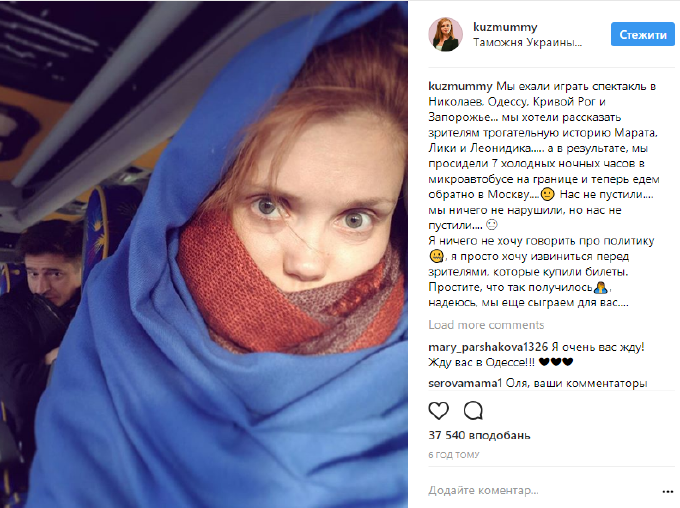 Проблем с пересечением границы с Украиной не возникло у другого актера – Ивана Стебунова. Однако он, по словам пограничников, после инцидента с коллегой Жидковым въезжать в страну не захотел. Информации относительно третьей участницы театральной постановки Ольги Кузьминой в Госпогранслужбе нет, однако на своей страничке в Instagram актриса написала следующее: «Нас не пустили… Мы ничего не нарушили, но нас не пустили».