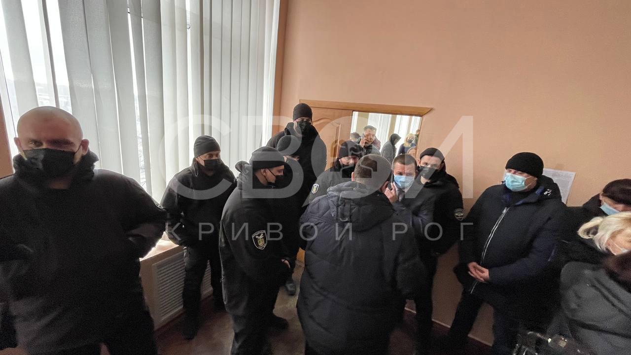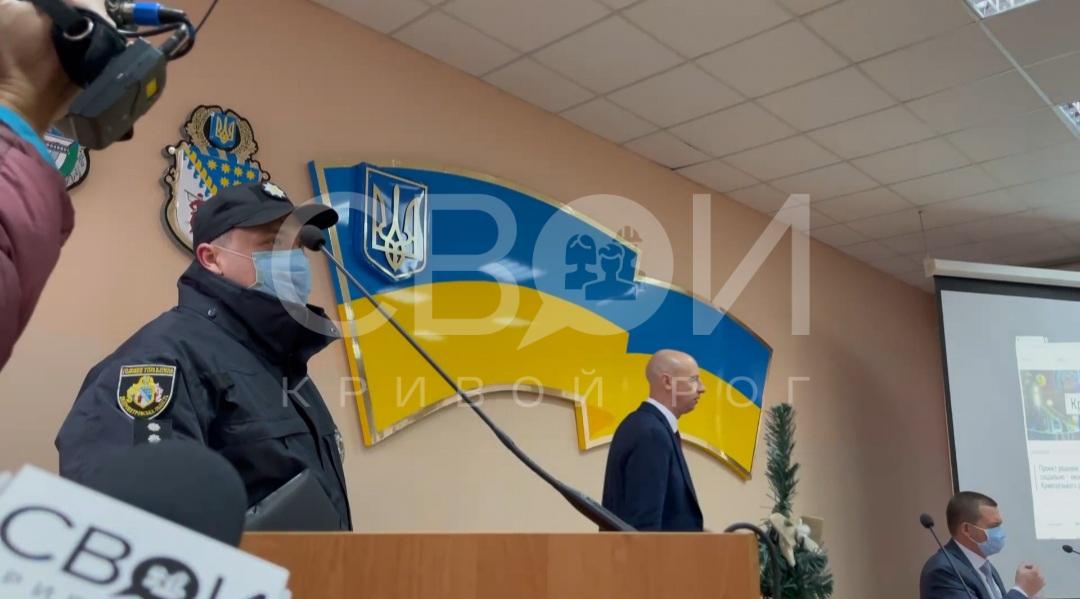 В это время сотрудники городской полиции молча наблюдали за происходящим, а после к трибуне подошел правоохранитель и сообщил присутствующим, что в полицию поступило сообщении о минировании. Людей попросили покинуть здание. Несмотря на требование полицейских, глава Криворожской районной рады Виктор Мудрый объявил сессию открытой.