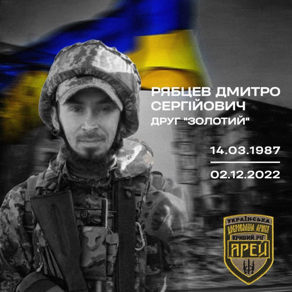 6 грудня Кривий Ріг простився ще з одним сином України – Дмитром Рябцевим. Чоловік до останнього подиху захищав українську землю, за яку віддав найцінніше – життя. Загинув воїн, через протитанкову міну, на яку наїхав разом із побратимом, при виконанні бойового завдання на Херсонщині.