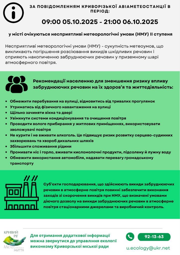 Станом на ранок 6 жовтня індекс якості повітря складає – 207, що відповідає фіолетовому рівню. Стан повітря у Кривому Розі «дуже нездорово». Вплив на здоров’я можуть негайно відчути чутливі люди. Здорові люди можуть відчувати утруднене дихання та подразнення горла за тривалого впливу. Обмежте заняття просто неба.