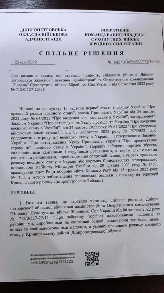 Спільним рішенням Дніпропетровської обласної військової адміністрації та Військового командування на їхній території скасовано заборону” на продаж алкоголю.