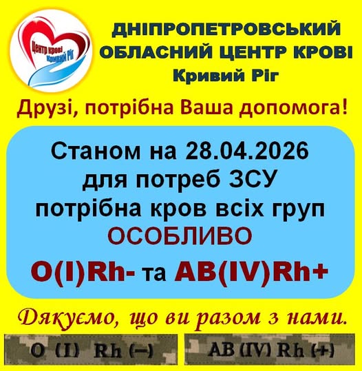 Обласний центр крові у Кривому Розі повідомляє про потребу в донорській крові всіх груп.
