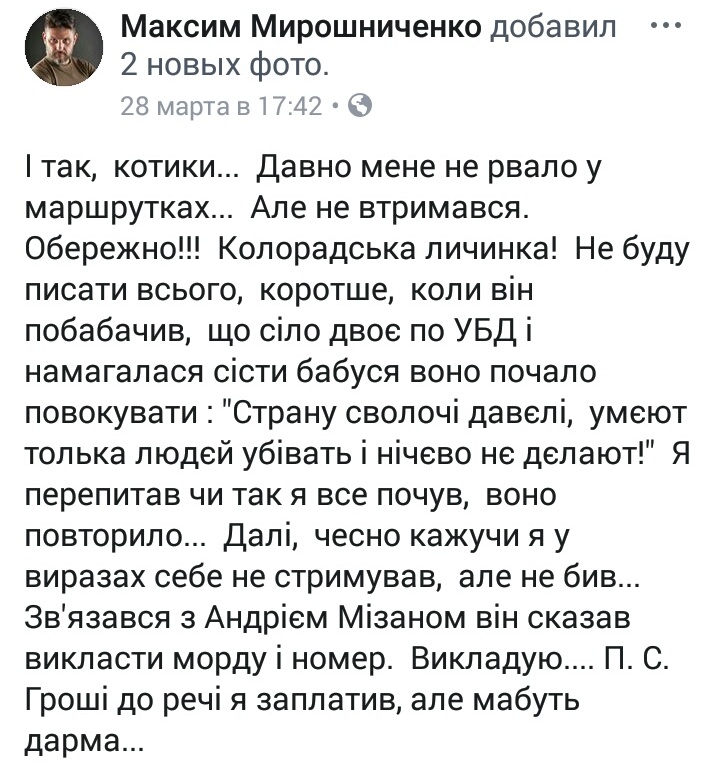 О факте некорректного поведения водителя маршрутного такси №286 по отношению к участниках боевых действий на востоке Украины в Фейсбуке рассказал Максим Мирошниченко.
