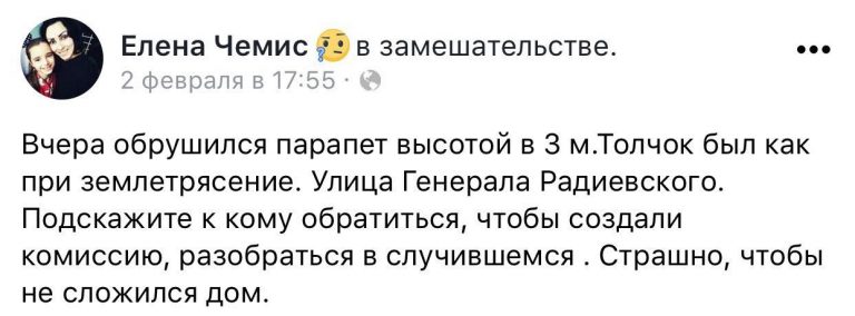 Недалеко от жилого дома по улице Генерала Радиевского обрушился парапет высотой в 3 метра. Толчок был таким, как при землетрясении.