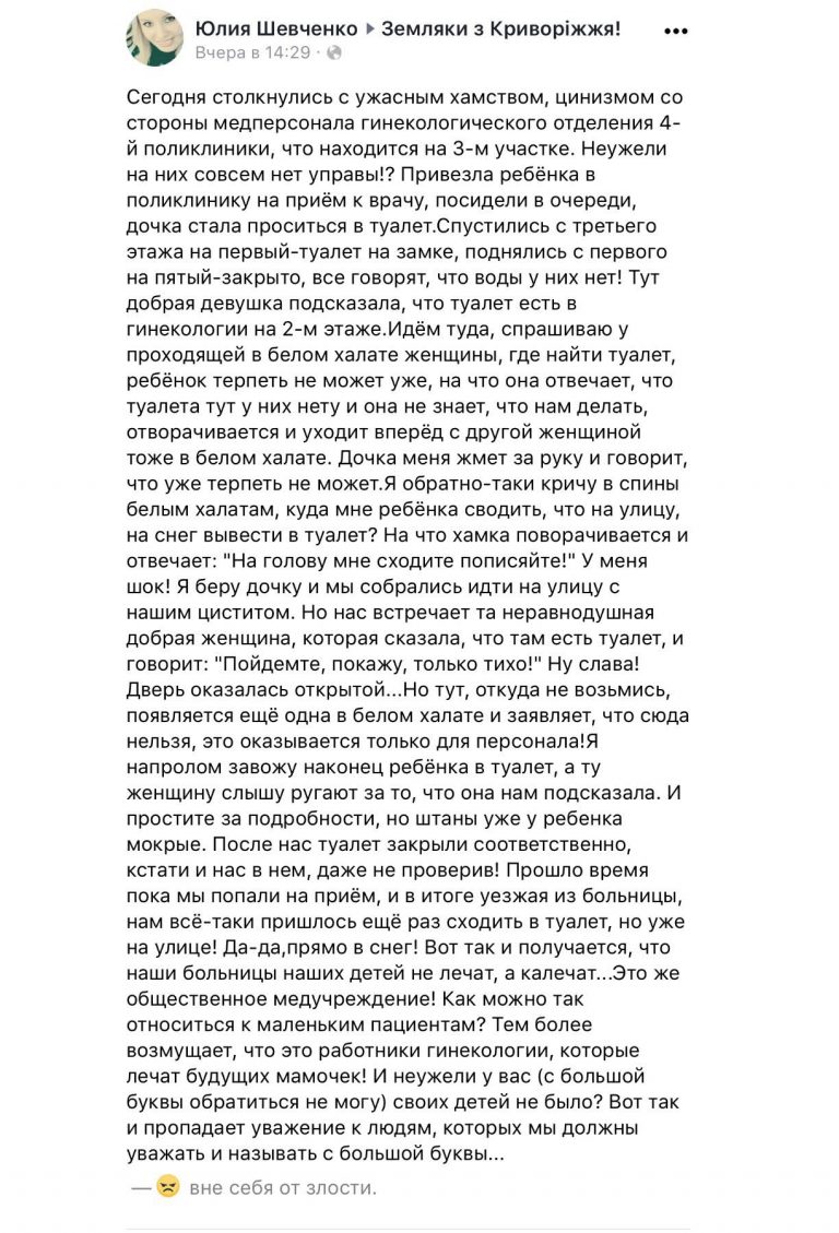 В гинекологическом отделении 4-й поликлиники (3-й участок), больному ребенку не разрешили сходить в туалет. По словам медиков, уборная предназначена только для медперсонала.