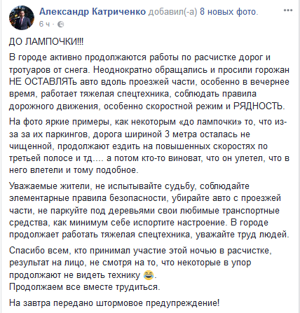 На своей странице в Фейсбуке заместитель мэра Кривого Рога Александр Катриченко обратился к водителям, которые оставляют свои транспортные средства на обочине проезжей части, чем усложняют работу снегоуборочной техники.
