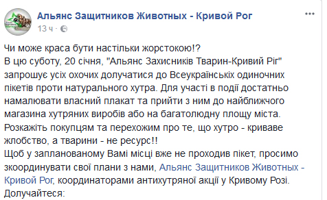 20 января в Кривом Роге под стенами магазинов, которые специализируются на продаже изделий из натурального меха и кожи, пройдут одиночные пикеты.