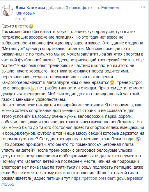 Криворожан просят поддержать петицию о проведении срочного ремонта в ДЮСШ №1, который находится по проспекту Металлургов.
