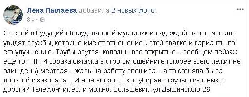 Криворожанка Лена Пылаева на своей странице в Фейсбуке поделилась ужасающими фото, на которых помимо стихийной мусорной ямы, рвущихся труб и открытых колодцев лежит труп собаки овчарки (скорее всего, не первый день).