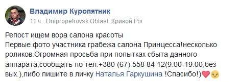 Информацию о краже и просьбу о помощи в соцсети разместили Владимир Куропятник и владелица салона Наталья Гаркушина.
