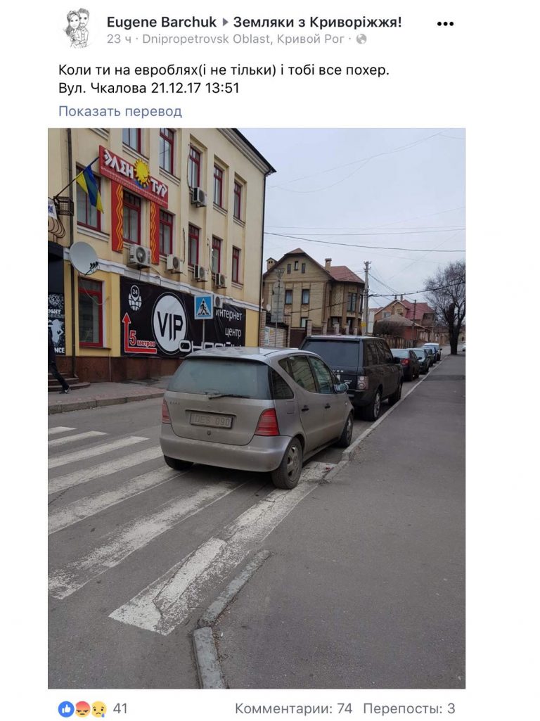 Криворожанин Eugene Barchuk в соцсети Фейсбук поделился фотографией автомобиля, водитель которого припарковался на пешеходном переходе по улице Чкалова на пересечении с проспектом Почтовый.