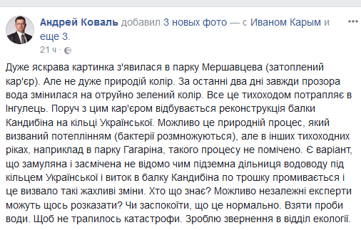 Депутат Центрального-Городского райсовета Андрей Коваль (Сила людей) на своей страницы в соцсети поднял вопрос о состоянии реки в парке им. Ф. Мершавцева.