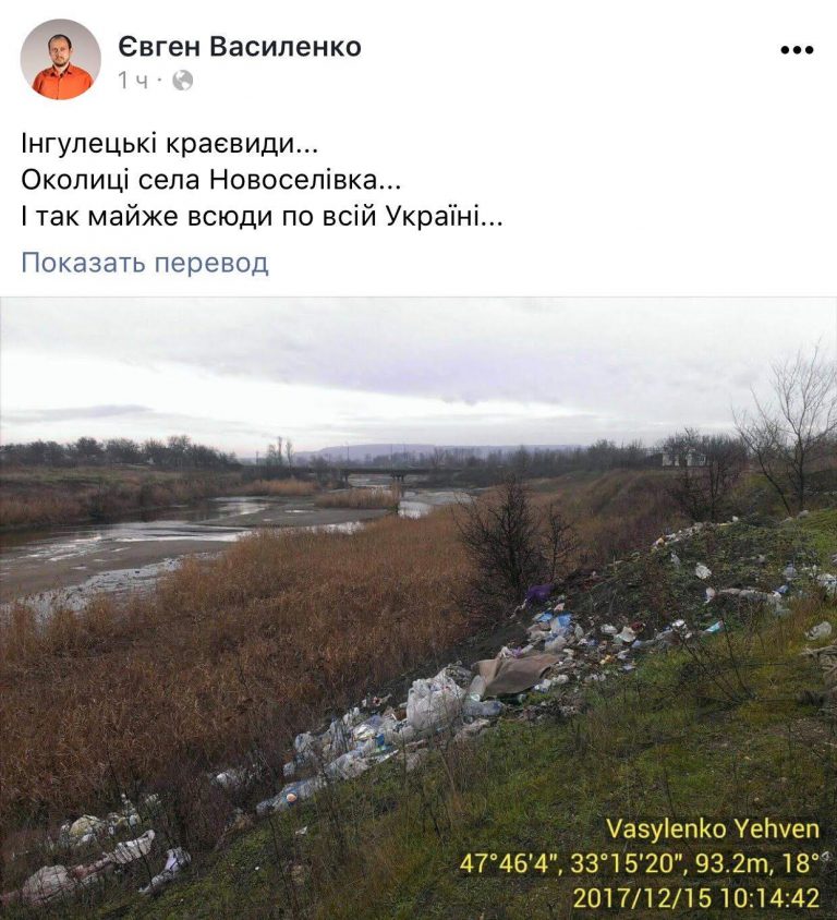Криворожский экологический активист Євген Василенко на своей странице в Фейсбуке поделился фотографией с Ингулецкими пейзажами (окрестности села Новоселовка), на которой «красуется» гора мусора (отходов) и одновременно культура наших людей.