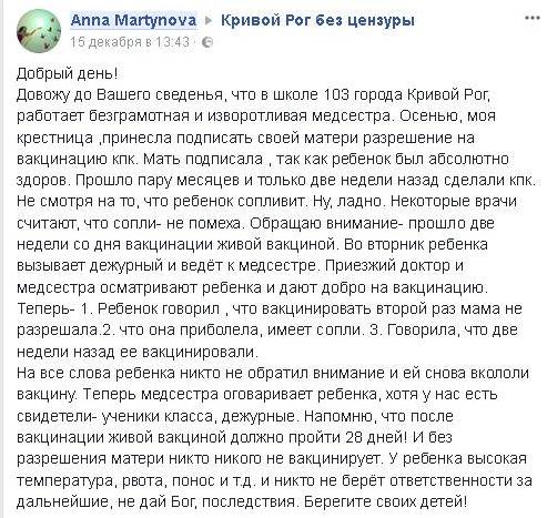 Криворожанка Anna Martynova утверждает, что ее крестнице в учебном заведении ввели два раза вакцину КПК (корь, краснуха, паротит).