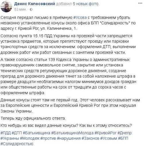 Пользователь соцсети Денис Колосовский возмущен тем, что уже на протяжении достаточно длительного времени на проезжей части перед офисом БПП "Солидарность", по адресу г. Кривой Рог, ул. Калиниченка, 1, установлены конусы, которые препятствуют парковке транспортных средств.