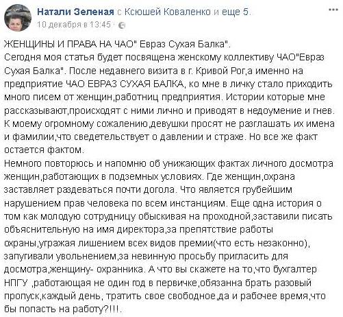 На руднике ЧАО "Сухая Балка" Группы DCH, в состав которой входят добычные шахты "Юбилейная" и им. Фрунзе, нарушают права работнитников-представителей женского пола, которые трудятся в подземных условиях.