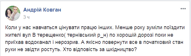 Житель Кривого Рога Андрей Ковган в соцсети Фейсбук выложил фото, на которых изображено некачественное восстановление КП «Кривобассводоканалом» дороги по улице В.Терещенко.