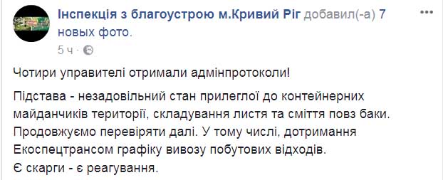 Инспекция по благоустройсву г.Кривого Рога на своей странице в Фейсбук разместила пост о вручении админпротоколов четырем управителям.