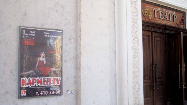 Весьма неприглядный вид приобрел городской театр драмы и музыкальной комедии имени Тараса Шевченко, расположенный в центре Кривого Рога – на проспекте Почтовом.