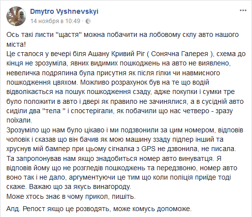 О неоднозначной записке, которую обнаружил криворожанин Дмитрий Вишневский, он поделился на своей странице в Фейсбуке.