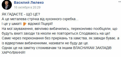 Пользователь соцсети Василий Лелеко обратился к владельцам заведений общественного питания с помощью фото кусочка пиццы, в котором он обнаружил нечто неподобающее.