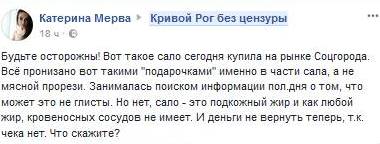 Пользователь соцсети Катерина Мерва напоминает криворожанам, чтобы были более бдительными при покупки сала на рынке Соцгорода.