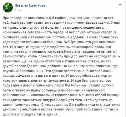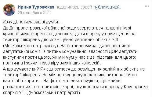 На своей странице в социальной сети депутат Днепропетровского областного совета Ирина Туровская («Самопомощь») выложила пост о том, какие планы имеет Украинская православная церковь Московского патриархата на некоторые здания на территории криворожских больниц.