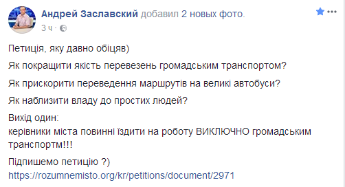 На странице в Фейсбуке президент Всеукраинского общества содействия развитию пассажирского транспорта Андрей Заславский презентовал свою новую петицию.