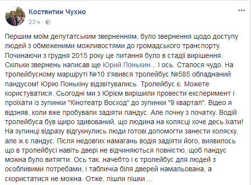 На своей странице в Фейсбуке депутат Терновского районного в городе Кривой Рог совета Константин Чухно описал ситуацию, которая сложилась с попыткой воспользоваться общественным транспортом человеку с