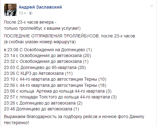 В Кривом Роге троллейбусы курсируют и в самое позднее время суток