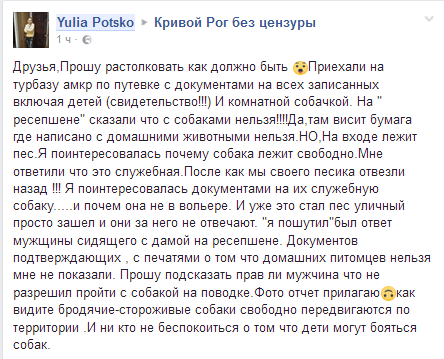 В одной из криворожских групп в Фейсбуке пользователь Юлия рассказала историю о том, как ее с домашней любимицей не пустили отдыхать на турбазу в Марьяновке.