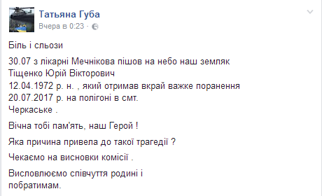 Трагедия в ходе учений военнослужащих на танковом полигоне в Черкасском случилась 20-го июля. От взрыва боеприпаса ранения получили 8 человек, среди которых пострадал и криворожанин Юрий Тищенко.